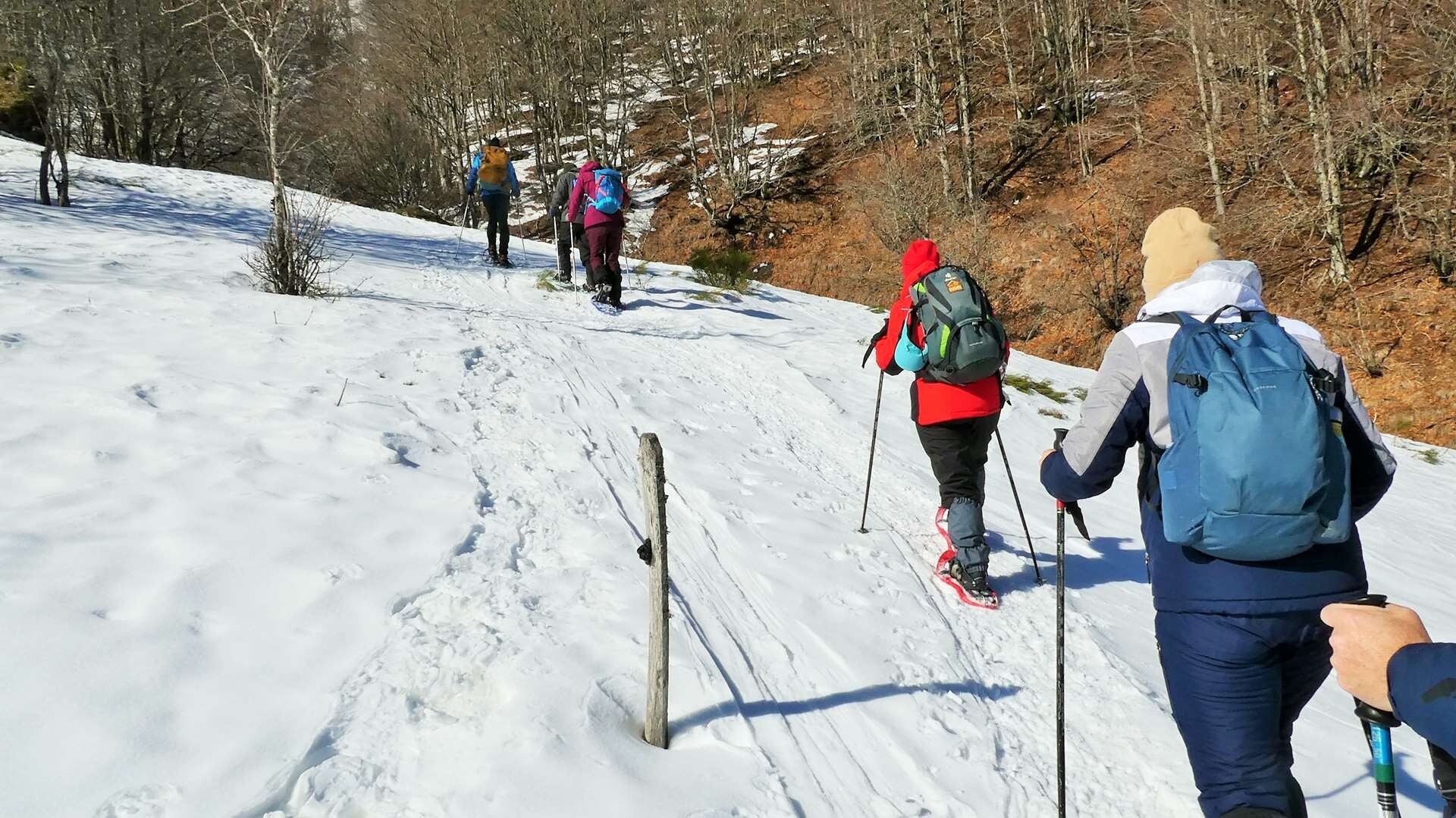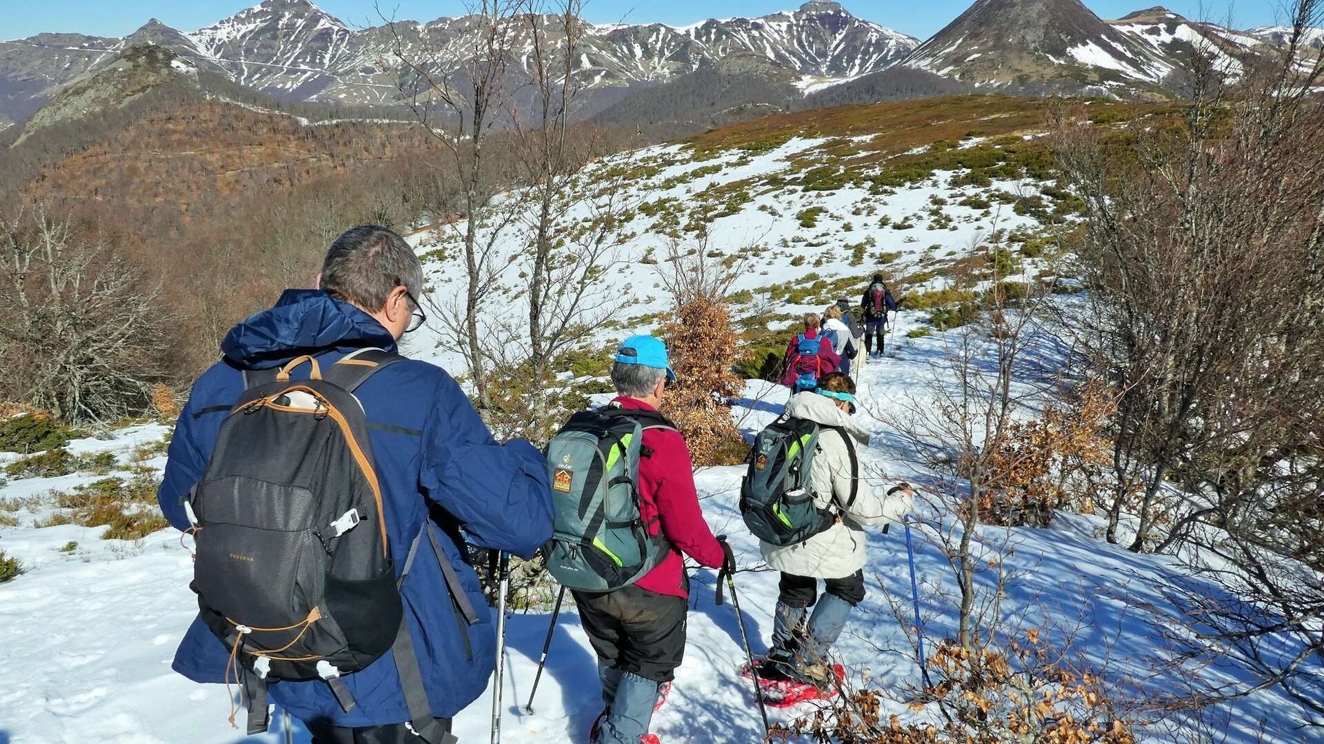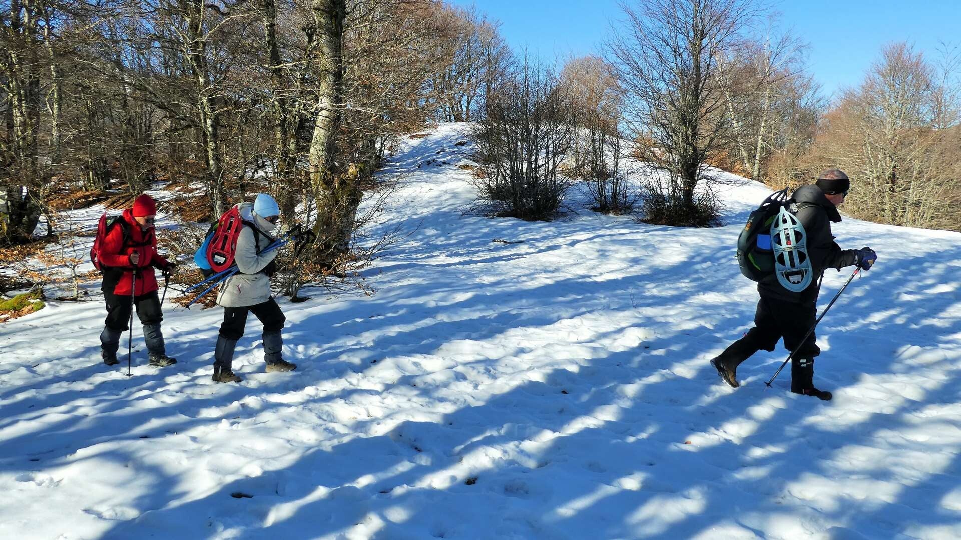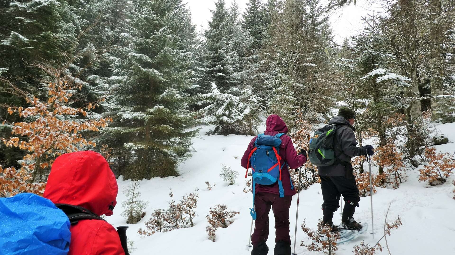 Certes la neige, comme partout, manque à l'appel. Mais, Luc, notre guide, nous mènera en altitude où nous pourrons chausser les raquettes.
