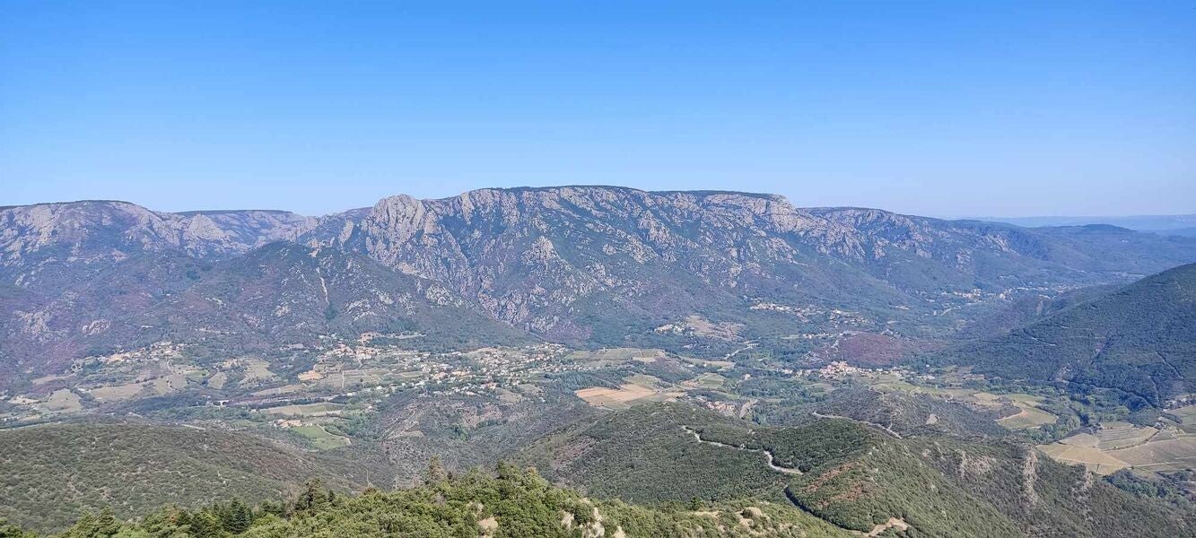 Cette fois-ci, le soleil et la chaleur étaient au rendez-vous, nous avons pu pique-niqué au sommet avec une vue sur le Caroux d'un côté et de l'autre côté une vue plongeante sur Vieussan, sur l'Orb et ses méandres.
