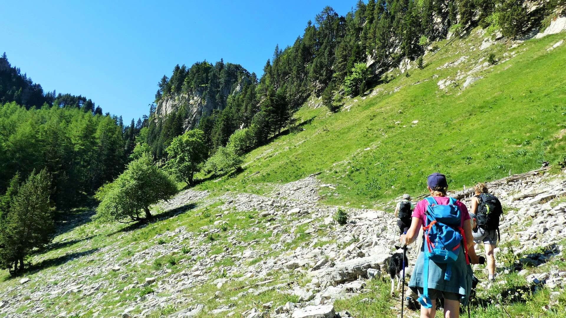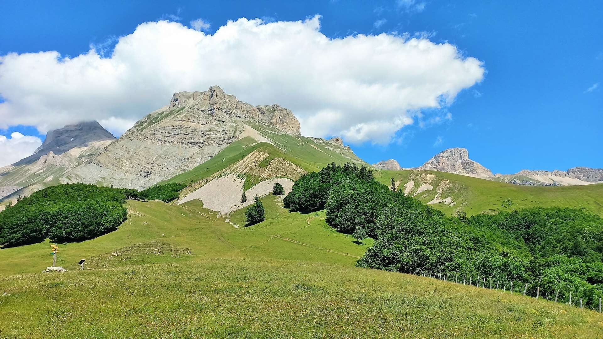 Lima attend notre départ. Cette très belle randonnée se déroule dans les vastes espaces domaniaux du secteur de Durbon. Les pelouses d’altitude succèdent aux profondes hêtraies sapinières riches en faune. L’ambiance est marquée par la présence des grands sommets du Dévoluy : les Garnesier, le Pic de Bure... Le pique-nique est installé au pied de beaux monolithes de calcaire face à un superbe panorama. Le dernier col est la surprise du jour. J M est un cachotier. Devant nous , exposé plein soleil le décor dénudé. Les roches sont à nues avec quelques espaces verdoyants. Le pire, c'est que la sortie est en haut. Nous allons transpirer. Pas après pas; nous gravissons ce dernier obstacle pour arriver au col de Plate Contier, à 1905 m d'altitude. Encore une fois, la vue de par et d'autre du col est sublime. Notre effort est récompensé.
