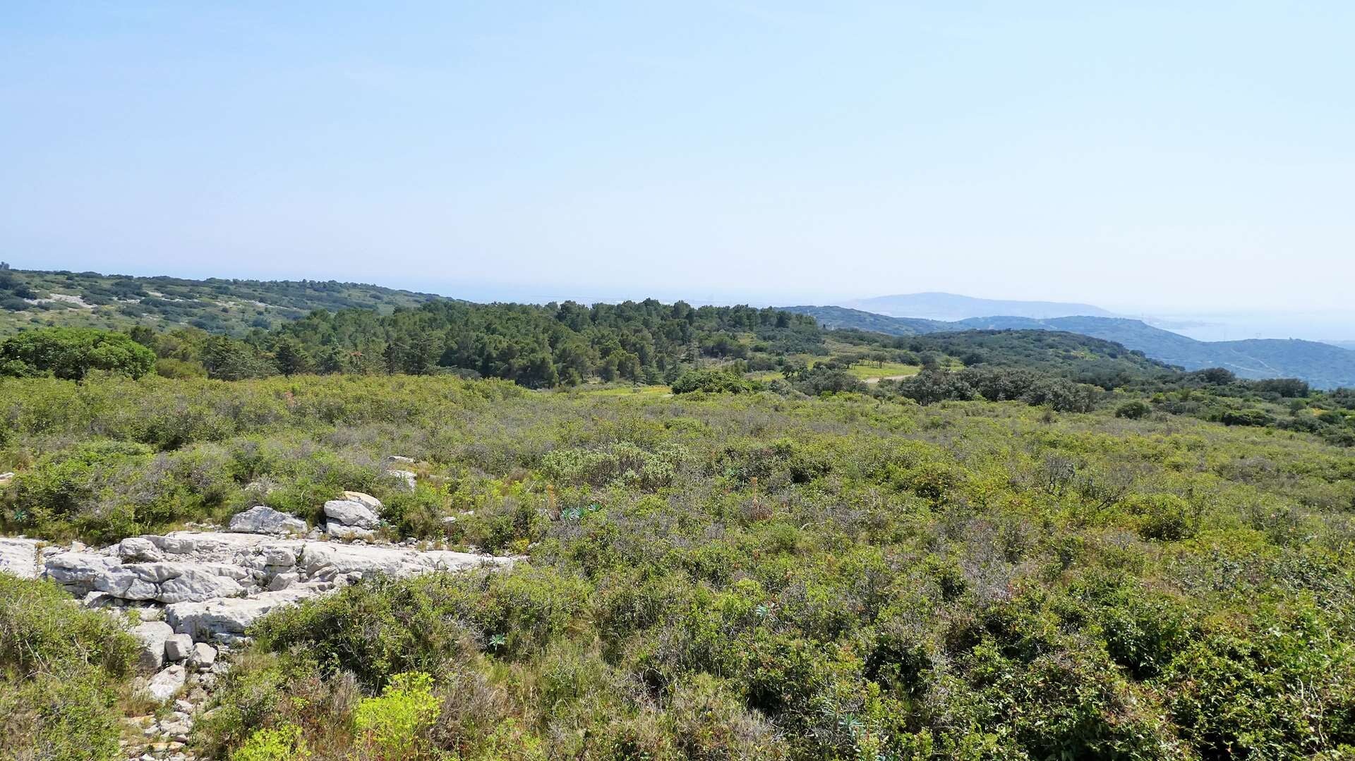 Abbaye de Saint Félix de Monceau, site où nous marchons régulièrement par des parcours à chaque fois différents. Le temps est bon et chaux, même si au loin l'orage gronde. Il ne sera pas pour nous. Les points de vue ne manquent pas: Balaruc - Frontignan -Séte - l'étang de Thau ou encore Mireval et Vic la gardiole pour ce qui est coté sud. Coté opposé une belle vue s' ouvre sur Gigean, plus loin c'est très sombre.... je dirai plutôt bleu nuit.