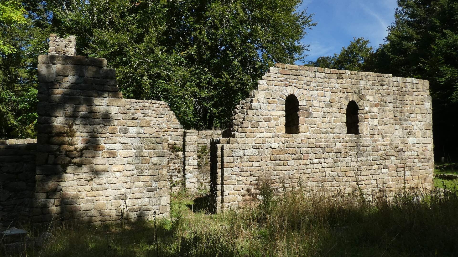 C'est avec une température matinale un peu fraiche que nous démarrons cette rando. Le ciel va vite se dégager et le soleil nous accompagnera toute la journée. 1er étape, c'est - Cambon - par une piste descendante. De superbes sculptures, en fer de récupération, et symbolisant les animaux de la région, trônent sur notre passage. A partir de Cambon nous allons longé l'Agout jusqu'aux ruines de l'église St-Pierre de l'Espinouse, ou nous prendrons notre casse croute vers 12h 45.